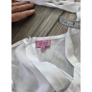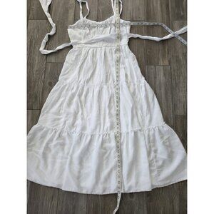 The Miami For Francesca tired white prairie dress in size medium features a solid pattern with a sleeveless design and square neckline. Made of polyester and rayon, the dress has a zip closure and comes in a midi length style. It is perfect for casual or party occasions, with a bohemian theme and fit & flare silhouette, making it a stylish choice for the summer and spring seasons. The dress also has accents in the form of a strap, adding a touch of detail to the overall design.