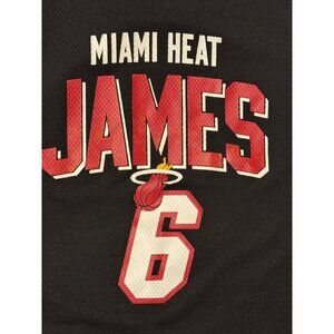 Breathable polyester mesh shirt with bold Miami Heat graphics and James #6 design. Ideal for basketball fans or casual wear.