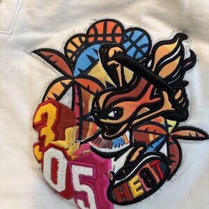 Design: Large multicolor raised embroidered patches including Miami Heat flaming ball logo and a graphic patch with "Miami," "Heat," and "305"