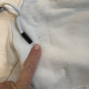 Moderate wear and fading with several small marks/spots shown in photos (front near hem, front leg, and back near pocket). Minor lifting/separation at the edge of the rear Pro Standard rubber logo patch with a loose thread visible. No holes or tears; waistband and drawstring intact.