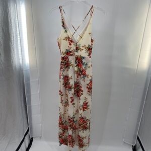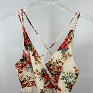 Floral romper with criss cross straps in back. V neckline. Zips up the back Bust 14”