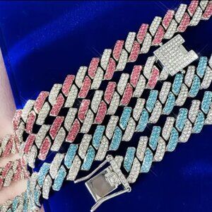 This is truly gorgeous! 16" long and nearly a half inch wide gold tone with cubic zirconia. THIS ONE IS ROSE GOLD. Can reverse it to have a solid gold look on the other side. Easy open clasp is very unique. Miami Cuban Link necklace is created by quality stainless steel and clear rhinestones, solid and durable, free of lead and nickel, healthy and safe. Anti-fatigue, anti-radiation, anti-allergy. Strengthen lobster claw Clasps, solid and durable. Easy to put on and take Off.