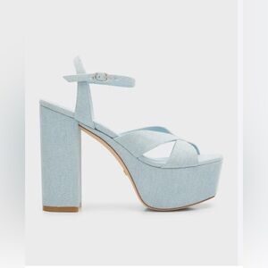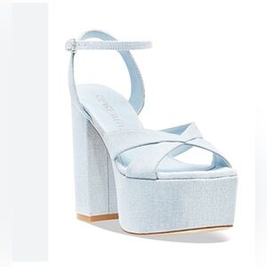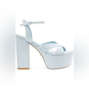 Crisscrossing vamp straps add trend-savvy appeal to a retro-inspired sandal lofted by a chunky platform and soaring block heel.
