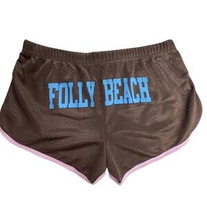 Women's shorts from Miami Style Sport. Cure brown shorts with pink trim and Folly Beach across the back. 100% Polyester. Due to light & screen variations, colors may vary slightly from the images