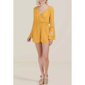 Miami Yellow Long Sleeve Wrap Romper Embroidered Bell Sleeves & Keyhole Back XXS
