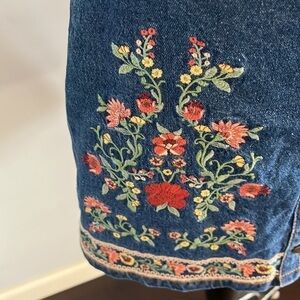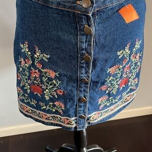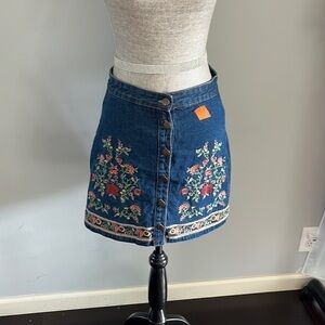Miami button up jean mini skirt with beautiful embroidery throughout. Medium