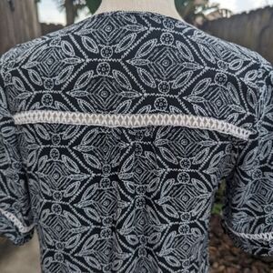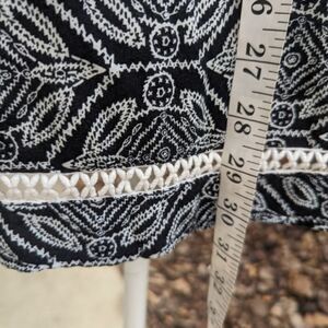Lightweight very soft, black and white blouse. This blouse lays long. It has button loops at v-neck for style. lace crochet x pattern trim around the bottom, the neckline and the sleeve.