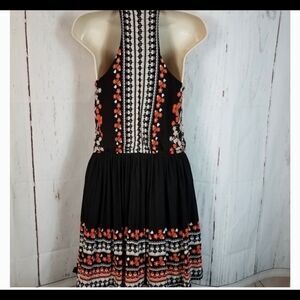 Black with light orange, white and tan floral print. Fully lined in a stretch fabric. Elastic waist. Sexy Cutout front. Racerback. Back zipper. Little pompom trimmed hem. Rayon with polyester lining. Excellent condition with no defects or flaws. Pet friendly home.