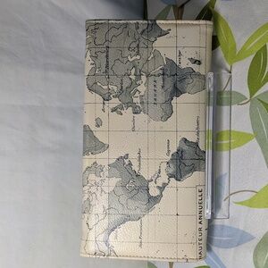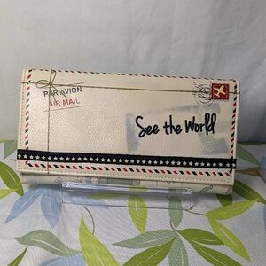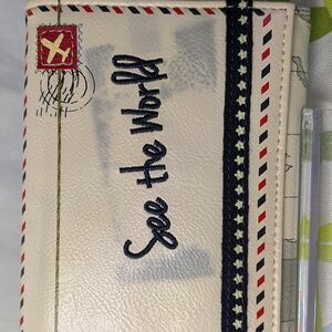 This fun travel organizer will be your faithful companion on all of your jaunts! Although many of our documents are now digital, it can't hurt to have a backup. Snappy snap closure contains one slip pocket labeled "Boarding Pass", One zip pocket with zippy zipper, and one larger pocket with "Money", and four dividers "Tickets", "Passport", "Documents", "Receipts, Etc.". Outside is beautiful world map and air-mail envelope motif.