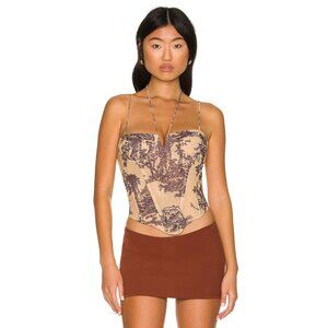 Description from retailer: Back zipper closure. Underwire unpadded cups with V-wire front. Halterneck tie closure. Boned bodice. Mesh fabric. Revolve Style No. MAOU-WS73. Manufacturer Style No. 7046-CL-GDT.