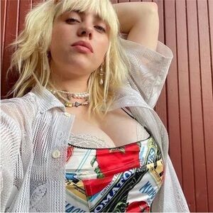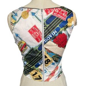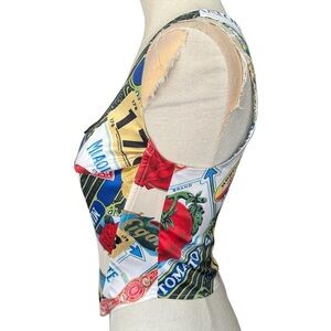 Deadstock stretch satin comprised of recycled polyester spandex corset-style tank top. Boning and graphic pattern printed throughout. As seen on Billie Eilish and Barbie Ferreira.