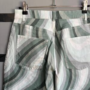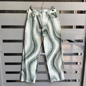 Miaou 'Fargo' pants in Swerve colorway. Various shades of green and white swirls throughout. High waisted with a straight, relaxed leg fit. 5-pocket styling. Zip and button closure. In great condition - very light pink marking on front of jeans that is barely noticeable (see last picture). Size medium - 13.5" waist; 11" rise; 29" inseam.