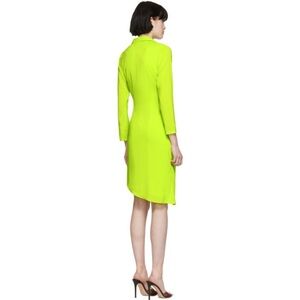 Long sleeve satin short dress in green. Layered construction featuring asymmetrical hem. Spread collar. Gathering and zip closure at side seam.