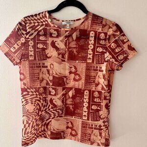 92% recycled poly, 8% lycra. Made in China. Green dry clean. Newspaper clipping graphic throughout. Semi-sheer mesh fabric. Revolve Style No. MAOU-WS53. Manufacturer Style No. 7026-CL-WNTR.
