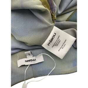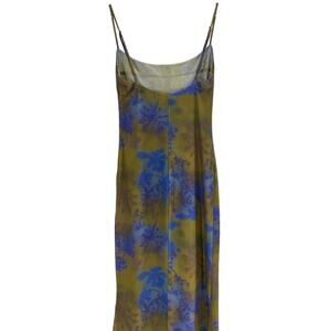 Miaou 'Paloma' Blue Polyester Elsesser Thais Dress Size S: fully lined, hidden side zipper closure, adjustable shoulder straps, lightweight mesh fabric with floral design and side seam slit, measurements: 14 inch bust x 48 inch length.