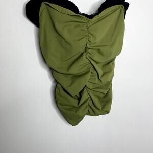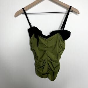 Stretch nylon jersey tank top. It features ruching throughout, layered construction, and a sweetheart neck. It also has adjustable elasticized spaghetti straps, hook-eye fastening at the back, and full jersey lining.