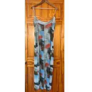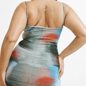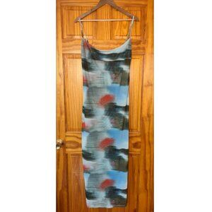 Y2K, mesh dress, mesh maxi, semi sheer, sheer overlay, bodycon, fitted silhouette, adjustable spaghetti straps, layered dress, recycled polyester, sustainable fashion, boutique brand, statement piece, Italian design, European design, night out, clubwear, resort dress, vacation dress, festival dress, concert outfit, Motion Blue, ombré dress, two-tone blue, date night, evening wear, size XL, plus friendly, curvy friendly, stretch mesh, rare find, hard to find, gently used, like new, designer dress, high end, trend alert