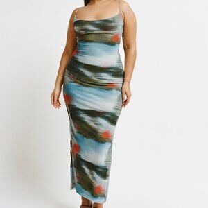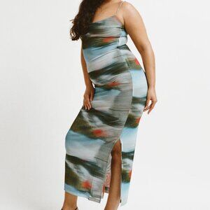 Semi-sheer stretch recycled polyester mesh maxi dress.