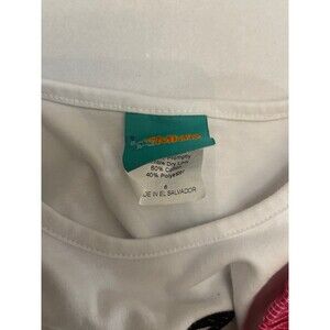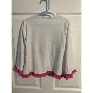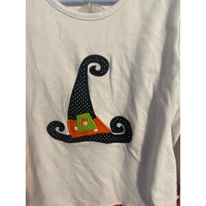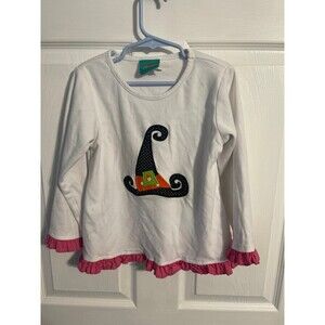 White long sleeve shirt with appliquéd witch hat, pink ruffle trim. 60% cotton, 40% polyester.
