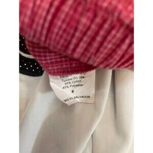 Pants have elastic waist. Pink with orange and black ruffles. 55% cotton, 45% polyester.