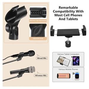 The Ramzi Black 6 in 1 Microphone Stand is a versatile and sturdy boom stand made of metal, designed to support various accessories such as a gooseneck, mic clips, and a tablet phone holder. With a sleek black color and a compact package dimension of 17.72 x 5.35 x 4.25 inches, this floor boom mic stand is suitable for holding microphones securely in place for musicians, public speakers, and audio professionals. The support boom feature allows for added flexibility in positioning the microphone for optimal sound quality and comfort during performances or recordings.