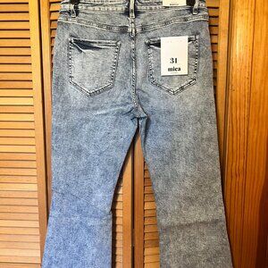 Strretchy size 31 mica jeans, bootcut with a high rise. Cute acid wash style with some raw edges.