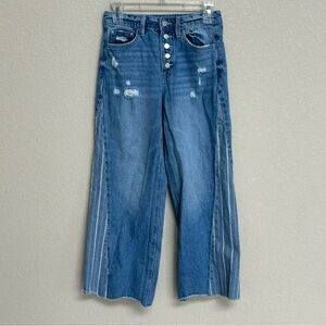 Mica Denim, size 26, fits like 24/25, distressed, wide leg, button fly, raw hem, striped side panel, 100% cotton, high rise, cropped, casual, women’s jeans, vintage-inspired, Y2K style, boutique, breathable, stylish, streetwear, denim
