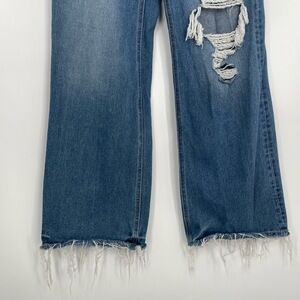 distressed, frayed hem, high waisted, ripped, blue jeans, cotton, casual, streetwear, modern denim, Mica Denim, size 28, staple piece, women, easy outfit, on trend, layering, relaxed fit, versatile style, everyday jeans, contemporary fashion, spring style, summer denim, capsule wardrobe
