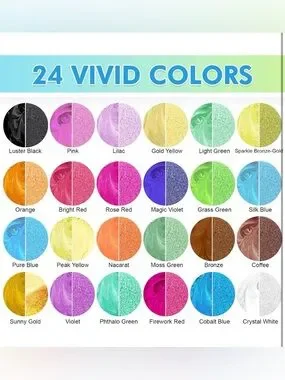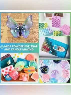 mica powder set for makeup and crafts. Includes 24 additional shades for versatile looks. Smooth, highly pigmented powders add metallic shine and blend easily. Ideal for eyes, lips, nail art, candles, soap and creative cosmetics. All new unused except one color that was tested. I no longer need these for my crafts!