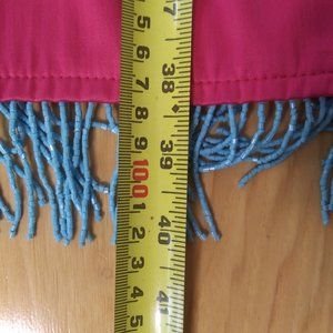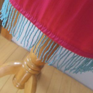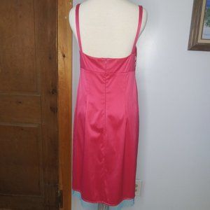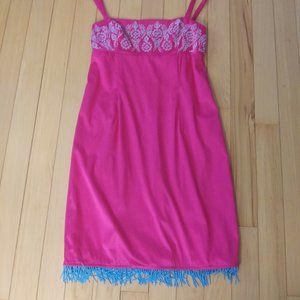 Mica pink dress w/ beads.Spot clean only. Dress is in pink color family has an orange lining and the small colorful bead work at the breast area remind me of candy sprinkles . Bead bead work fringe at the bottom is the blue color .family Tag says 12 but vintage runs small and the mannequin is a small so please refer to measurements : armpit to armpit ~ 15". Top of shoulder strap to bottom hem ~ 38" add 2" for the beading . 67% polyester . 30% nylon 3% spandex . Lining 100% poly . A pull on back of strap see last pic Barbiecore , slip dress?