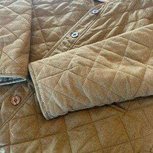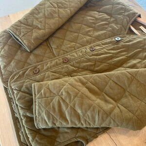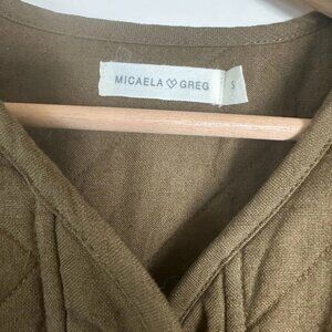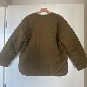 A mid-weight quilted jacket with a relaxed fit. Made from a cotton-linen blend and manufactured in India. Features a v-neckline, dropped shoulders, two front welt pockets, and a button-front hidden placket with one exposed button. Condition is new without tags. Material: 70% cotton, 30% linen with a polyfill lining. Color: fir/olive. Retail price $458. Tagged size S. Measurements approx.: pit to pit 22 in, length 25.5 in, shoulder to shoulder 21 in, sleeve length 18 in. Fit is wider and slightly oversized.