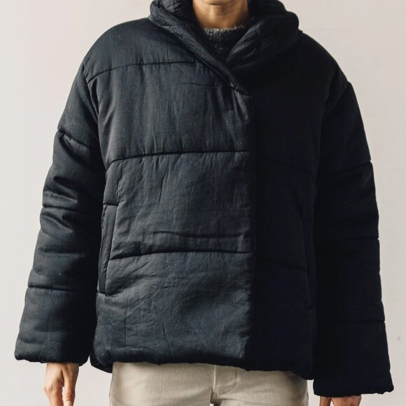 A thick puffer jacket with a rounded shawl neckline, front welt pockets and two snap closures at top of jacket. This piece has three stitch rows through the body and sleeves of the jacket, a very warm and cozy piece.