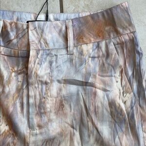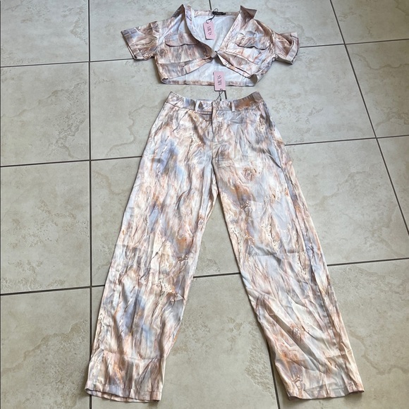 Trendy two-piece set with a cropped jacket and matching pants. Features an abstract pattern in earthy tones.