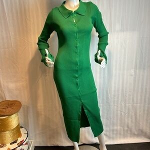 Micas Green Rib Knitted Collared Button Strips Flared Dress Size Large RefI027