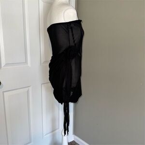Keywords: Micas, corset dress, medium, black, sheer bodice, boning, flower detail, draped style, short dress, women's fashion, polyester, elastane, machine washable, new with tags, evening wear, goth, sexy, intimate,