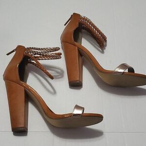 Almond and golden metallic heeled sandals. Peep toe and covered heels. Four braided straps around the ankle (two almond and two metallic). Zipper con the back. Man made materials.
