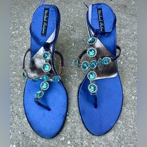 Step out in style with these gorgeous Michael Antonio stiletto heels in a striking royal blue. Featuring sparkling turquoise and silver jeweled accents, these sandals add the perfect touch of glamour to any outfit.