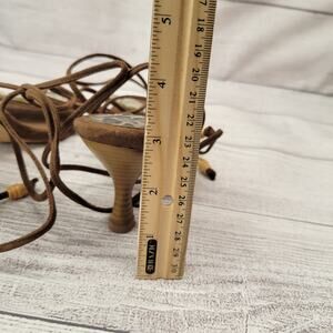 Comments: Single strap heeled sandals have a tribal vibe with the ankle wrapping tie straps, cheetah print foot bed and leaf print tiles across the strap.