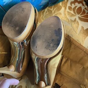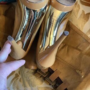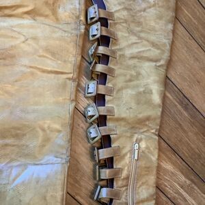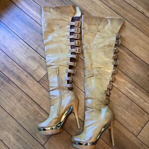 Daring, platform boot in golden faux leather materials. Some wear to pleather on the front of the boot. Size 11. All man made materials. Zips on side. Adjustable buckle straps thigh to ankle. Gold accented platform. Heel height 5.5”