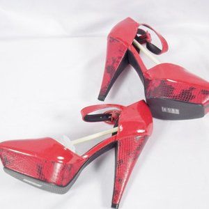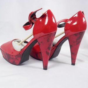 Red glossy (patent like) on top. Platform and heel are done in a red and black reptile-like pattern