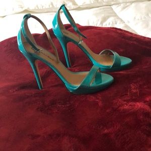 Michael Antonio Turquoise Patent Leather Ankle Strap Sandal.