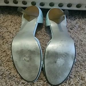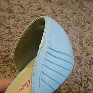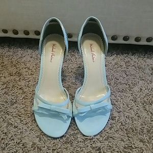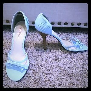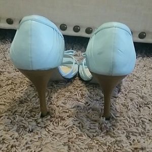 Pastel blue open to heel with cute bow detail. Heel is 4 inches long from floor to base of shoe. Small defect as shown in last two photos.