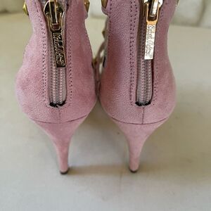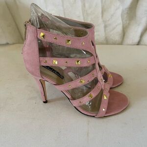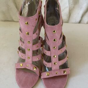 Michael Antonio light pink faux suede gladiator heels with gold tone studs SZ8