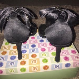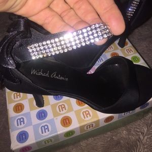 Black Satin sz 8 - rhinestone ankle strap -bow tie embellished 3 1/2" ( tiny scratch on left heel / pictured)