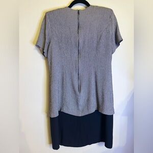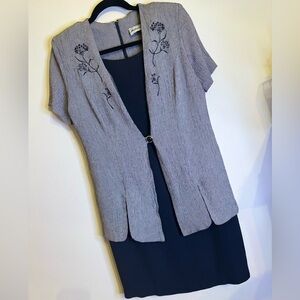 Elegant vintage Michael Blake petite dress with attached short-sleeve jacket overlay. Features a navy sheath dress, gray micro-check jacket with navy floral embroidery, and a single decorative button. Back zipper closure, fully lined. Perfect for office, formal events, or church.