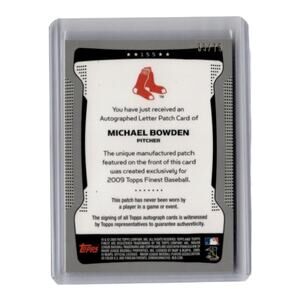 This 2009 Topps Finest baseball card features Michael Bowden, a pitcher for the Boston Red Sox. Known for his pitching skills, Bowden has contributed to the Red Sox's pitching staff with his talent and effort. This card is a highly collectible piece from the 2009 Topps Finest set, showcasing a unique autographed letter patch on the front, a standout feature that collectors seek.