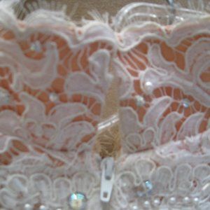 Embroidered Alencon lace with rhinestones over blush/coral satin-like material