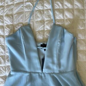 This elegant blue dress by Michael Costello features a striking asymmetrical high-low hemline, perfect for making a statement at weddings or cocktail events. The sleeveless design with a halter neckline adds a touch of sophistication, while the flowing fabric ensures a graceful silhouette. Ideal for any special occasion, this dress combines style and comfort effortlessly.