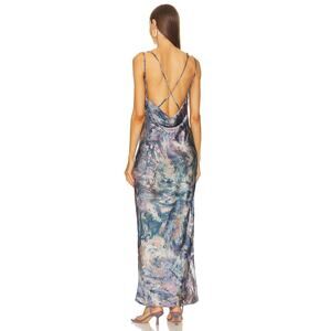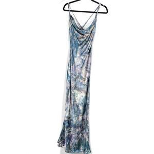 Michael Costello Braxton Dress Oil Abstract Print Maxi Slip Blue Satin Slit Sz S