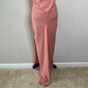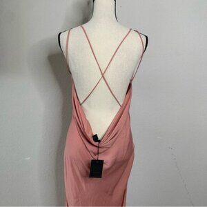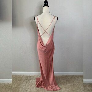Turn heads in this effortlessly sultry mauve satin slip dress, the perfect balance of sophistication and allure. This dress features a soft cowl neckline that drapes elegantly across the chest. Ultra-thin spaghetti straps crisscross delicately across the open back. The silhouette is sleek and body-skimming, crafted from a silky satin fabric that glides smoothly over the figure. A thigh-high slit on one side adds a flirty edge while enhancing movement and showcasing the legs. The back features a dramatic draped cowl detail.